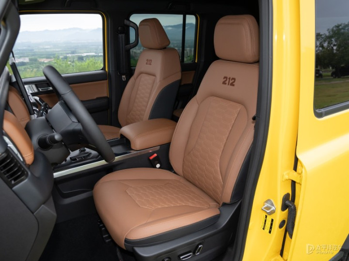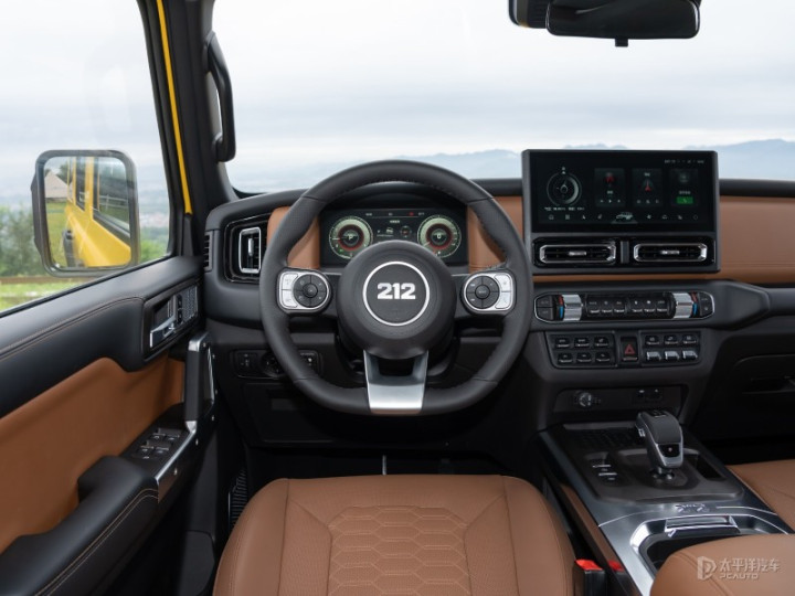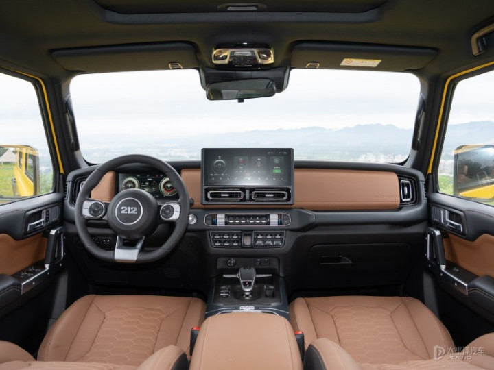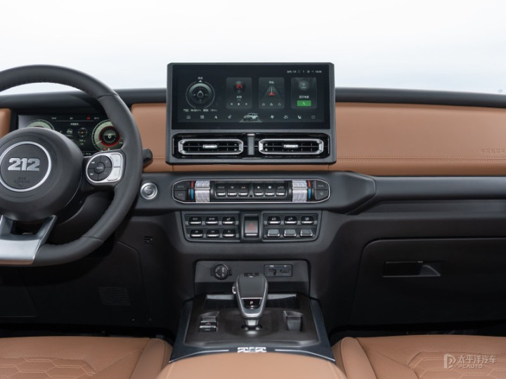 内饰保持传统硬派SUV风格,保留了不少物理按键。本次212 T01(询底价|查参配)检阅官内部升级点在于前仪表、门护板等区域软性皮质包覆率超过 80%,起码质感上有明显提升。另外车辆新增黑棕内饰配色,不再局限于全黑的设定。
